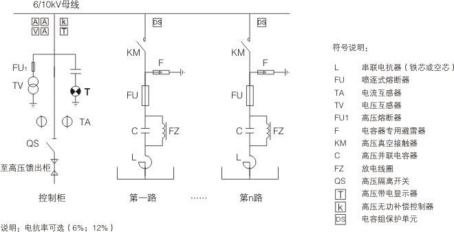 DEHVC型高壓智能無(wú)功補(bǔ)償裝置應(yīng)用傳統(tǒng)的投切電容器方式向系統(tǒng)中注入容性電流,補(bǔ)償無(wú)功功率,調(diào)節(jié)功率因數(shù)。其核心器件主要有控制器、高壓真空接觸器、電容器、電抗器及保護(hù)裝置等構(gòu)成??刂葡到y(tǒng)對(duì)系統(tǒng)電壓、電流信號(hào)進(jìn)行采樣及分析處理,以功率因數(shù)及系統(tǒng)電壓為控制參數(shù)判斷并輸出控制指令,控制接觸器動(dòng)作實(shí)現(xiàn)對(duì)電容器組的投切,使系統(tǒng)功率因數(shù)控制在設(shè)定范圍內(nèi)。