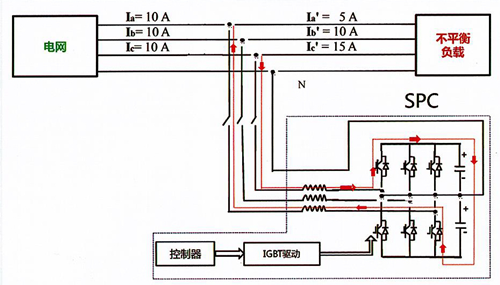 DESPC裝置開啟后,通過外接電流互感器(CT)實(shí)時(shí)檢測(cè)系統(tǒng)電流,并將系統(tǒng)電流信息發(fā)送給內(nèi)部控制器進(jìn)行處理分析,以判斷系統(tǒng)是否處于不平衡狀態(tài),同時(shí)計(jì)算出達(dá)到平衡狀態(tài)時(shí)各相所需轉(zhuǎn)換的電流值,然后將信號(hào)發(fā)送給內(nèi)部IGBT并驅(qū)動(dòng)其動(dòng)作,將不平衡電流從電流大的相轉(zhuǎn)移到電流小的相,最后達(dá)到三相平衡狀態(tài)。